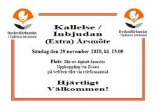 Extra årsmöte för lokalföreningen Dyslexiförbundet Sydöstra Sörmland, lördag den 23 november, kl. 14.00. Frågeställning: Ska Sydöstra Sörmland återuppta sin verksamhet eller ska de läggas ner?