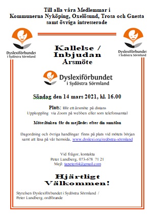 VÄLKOMMEN! på Årsmöte med Dyslexiförbundet i Sydöstra Sörmland - Söndag den 14 mars 2021, kl. 16.00