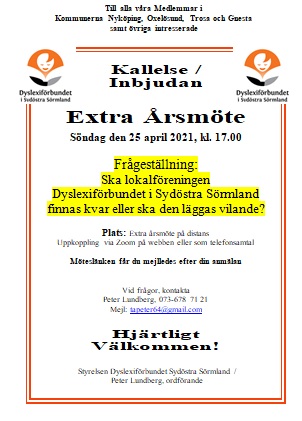 Välkommen på Extra årsmöte med Dyslexiförbundet i Sydöstra Sörmland, Söndag den 25 april, kl. 17.00