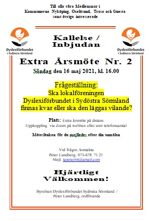 Välkommen på Extra årsmöte Nr. 2 med Dyslexiförbundet i Sydöstra Sörmland, Söndag den 16 maj, kl. 16.00